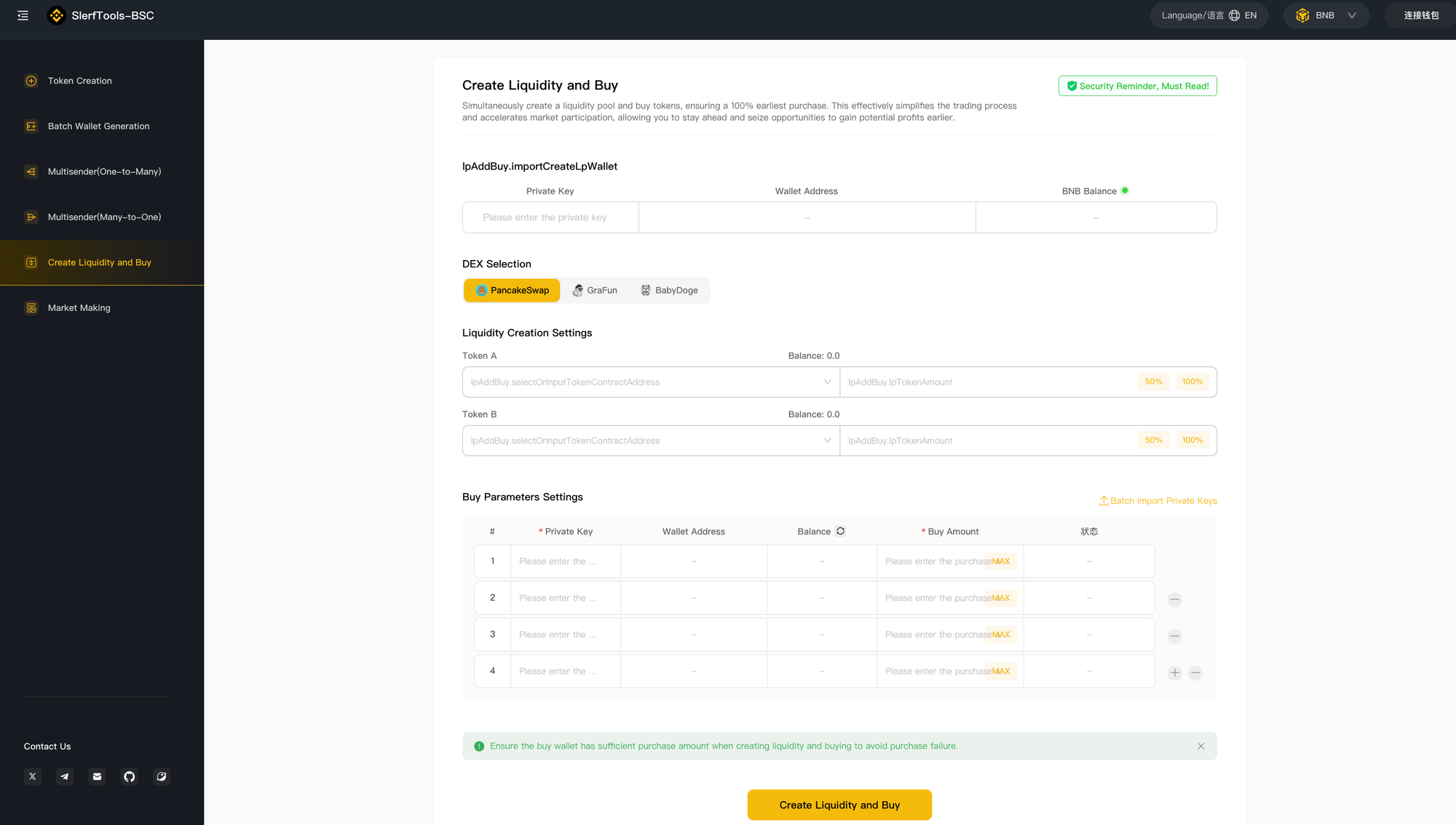 - Input Liquidity Wallet Address: Import the private key of your primary wallet address.