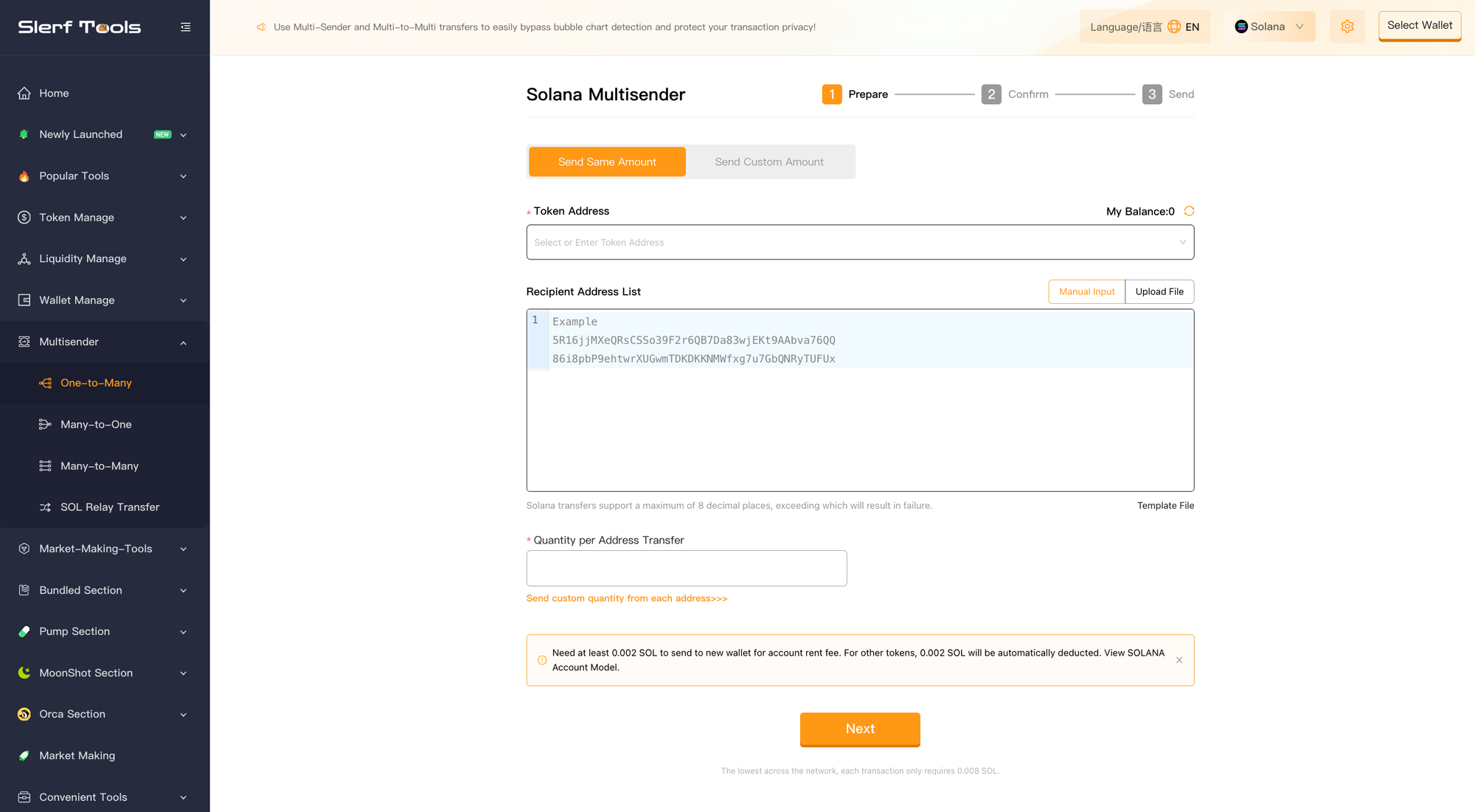 Follow these steps to airdrop SPL tokens using the SlerfTools Batch Sending Tool: