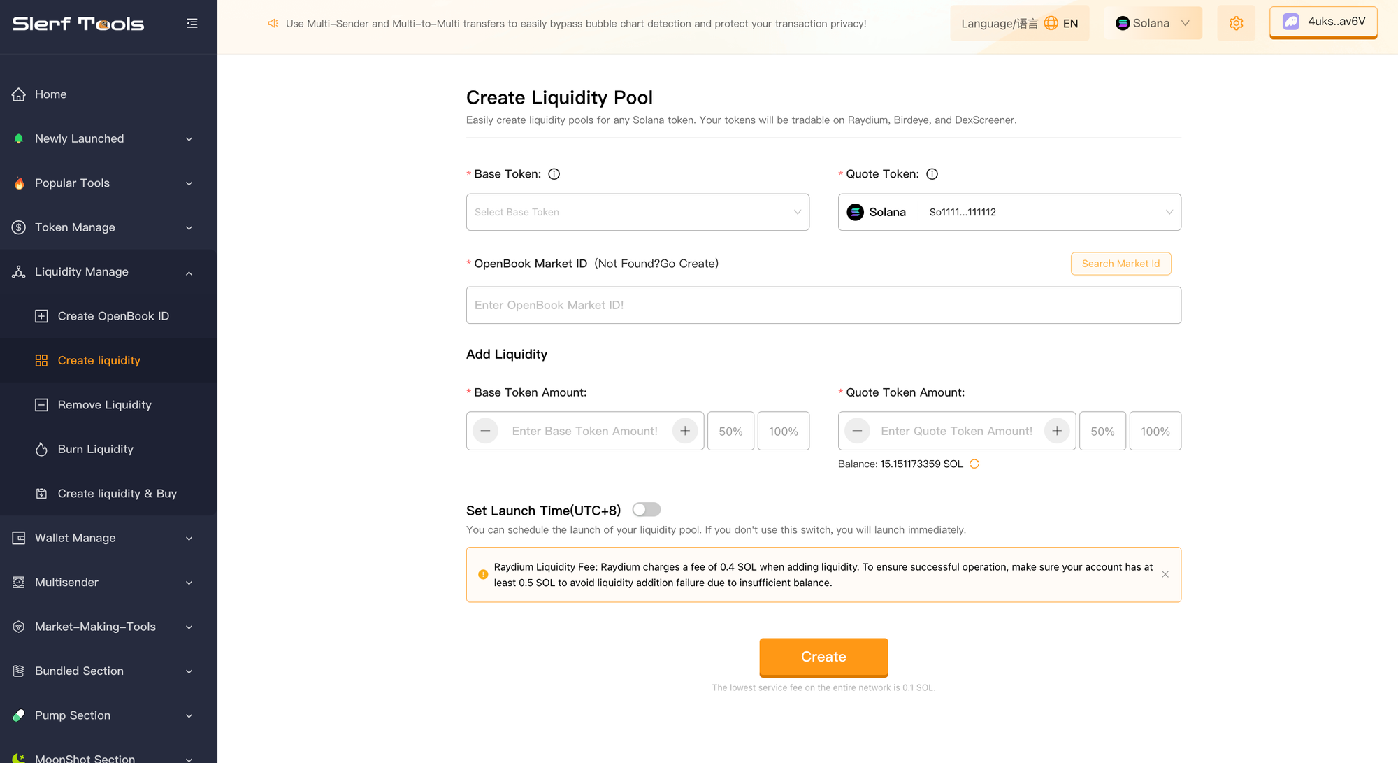 Whether you initially created liquidity on Raydium or through tools like SlerfTools, you can use SlerfTools’ Liquidity Management Tool to easily add or remove liquidity. Below is a step-by-step tutorial.