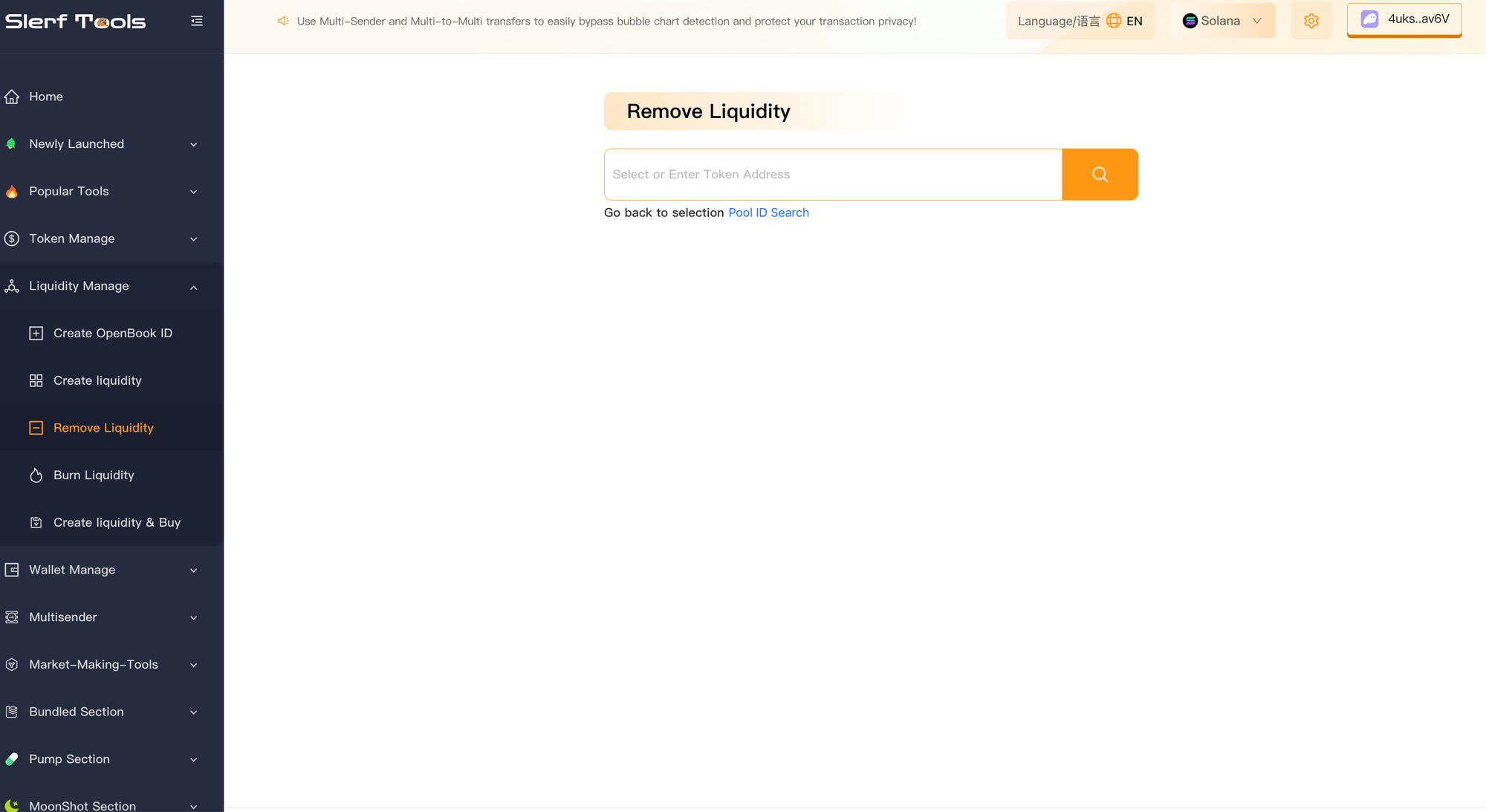 First, navigate to the Liquidity Management section on SlerfTools. You can find it under the Solana menu labeled Manage Liquidity.